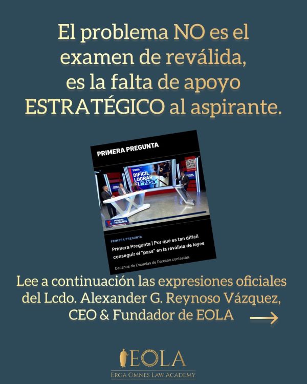 En un reciente comunicado dirigido a la comunidad jurídica, el Fundador & CEO de Erga Omnes Law Academy (EOLA), el Lcdo. Alexander G. Reynoso Vázquez, expresó su preocupación ante el debate televisivo sobre el bajo porcentaje de aprobación en la reválida general de derecho en Puerto Rico. Este se alejó del discurso derrotista y desesperanzador exhibido en las respuestas brindadas por los líderes académicos y proveedores de repasos de reválida durante la entrevista.