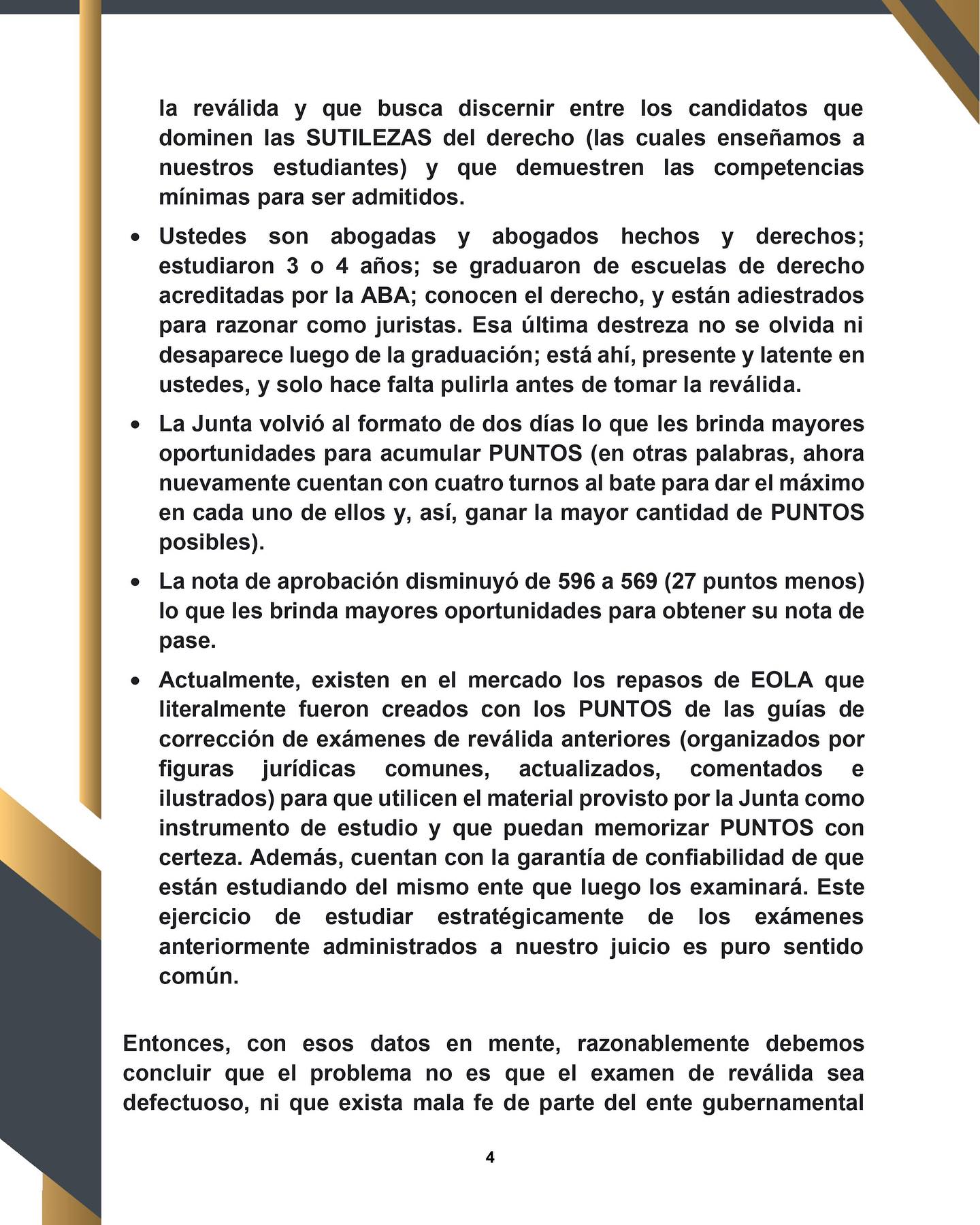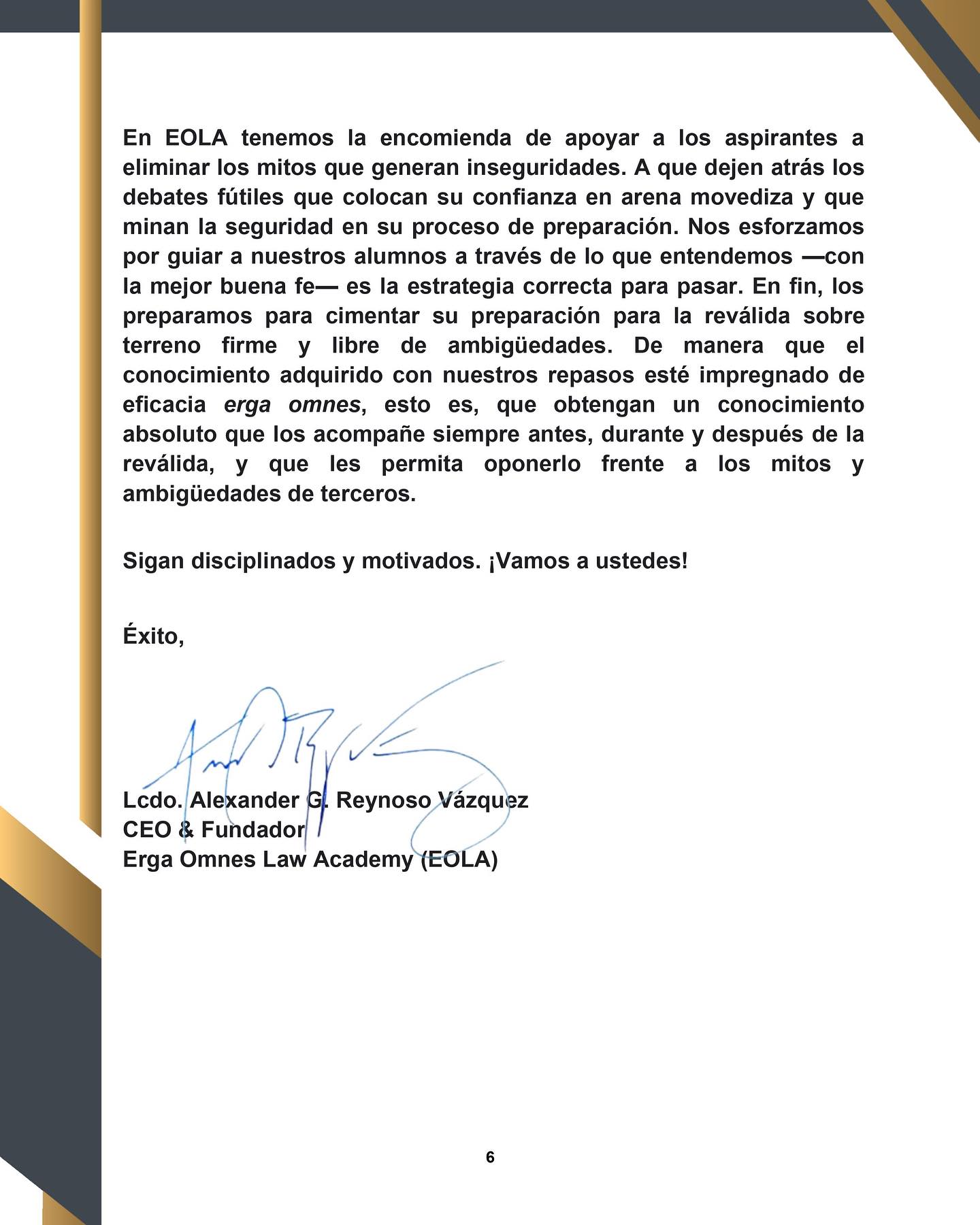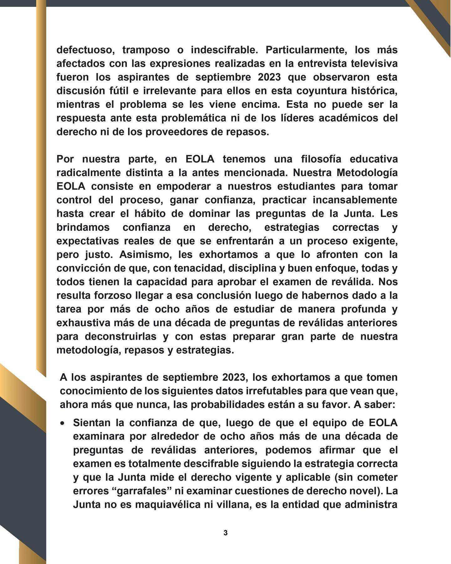 En cambio, aclaró que EOLA propone una filosofía educativa radicalmente diferente, centrada en empoderar a los estudiantes para dominar el examen con confianza y estrategias adecuadas. La Metodología EOLA, basada en años de estudio y análisis de más de una década de preguntas de reválidas anteriores, busca cambiar el enfoque de los aspirantes hacia la preparación efectiva y la comprensión de las Sutilezas del Derecho vigente.