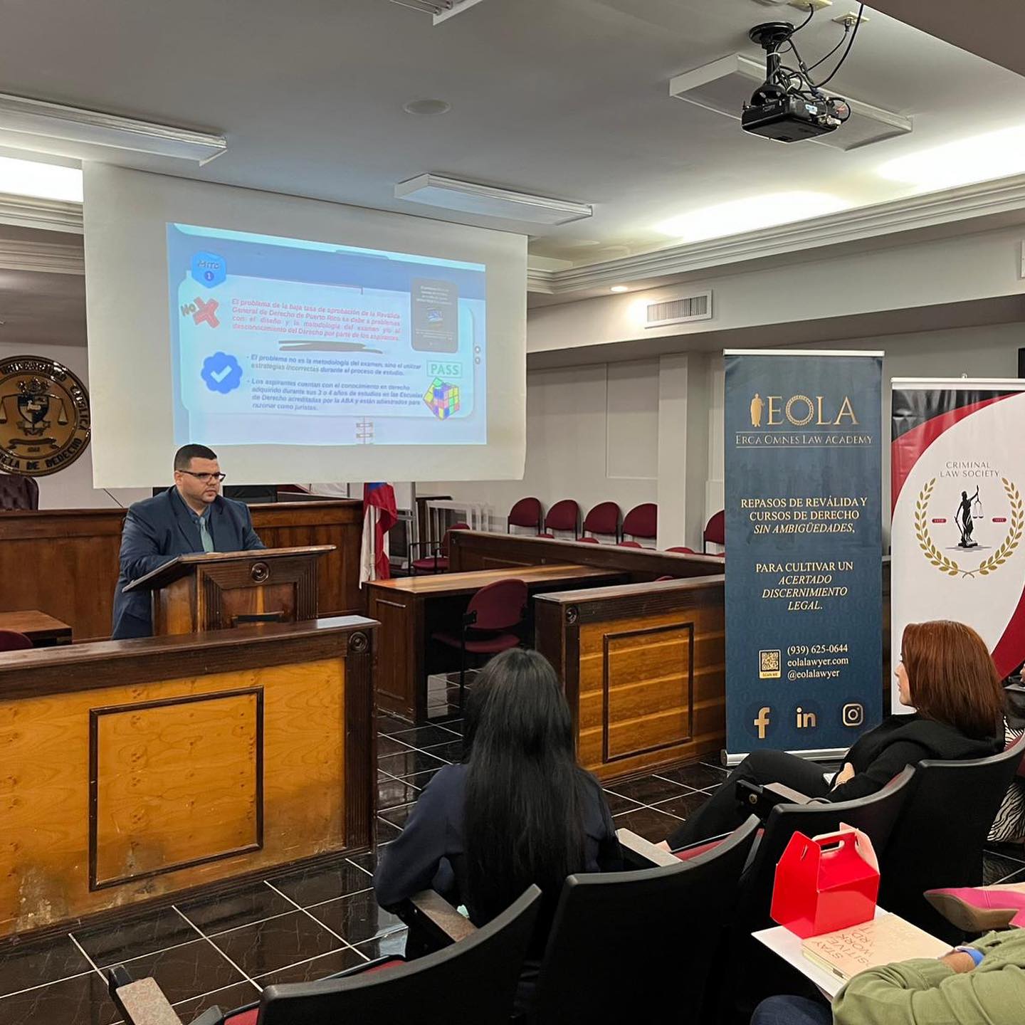 Erga Omnes Law Academy (EOLA) llegó con fuerza a la Escuela de Derecho de la PUCPR, ofreciendo una charla imperdible intitulada «Mitos y realidades de la Reválida General de Derecho de Puerto Rico y cómo prepararse estratégicamente para alcanzar el éxito». La conferencia, auspiciada por la Criminal Law Society de la PUPR, atrajo a una audiencia ávida de conocimiento y oportunidades.