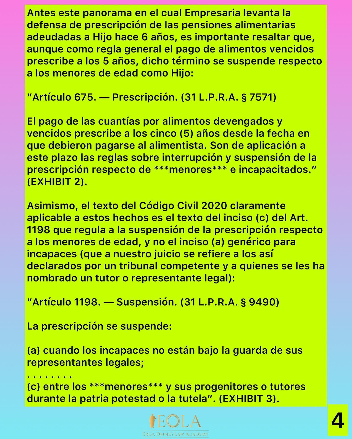 El corazón de esta controversia de derecho es si aplica la defensa de prescripción ante el cobro de una deuda de alimentos para un menor de edad. Es norma de derecho básica del Derecho de Familia que, aunque las deudas de alimentos tienen un plazo de prescripción de cinco años, la prescripción se suspende en el caso de menores de edad, de acuerdo a lo establecido en los artículos pertinentes del Código Civil de Puerto Rico (véase el análisis detallado en las imágenes de arriba).