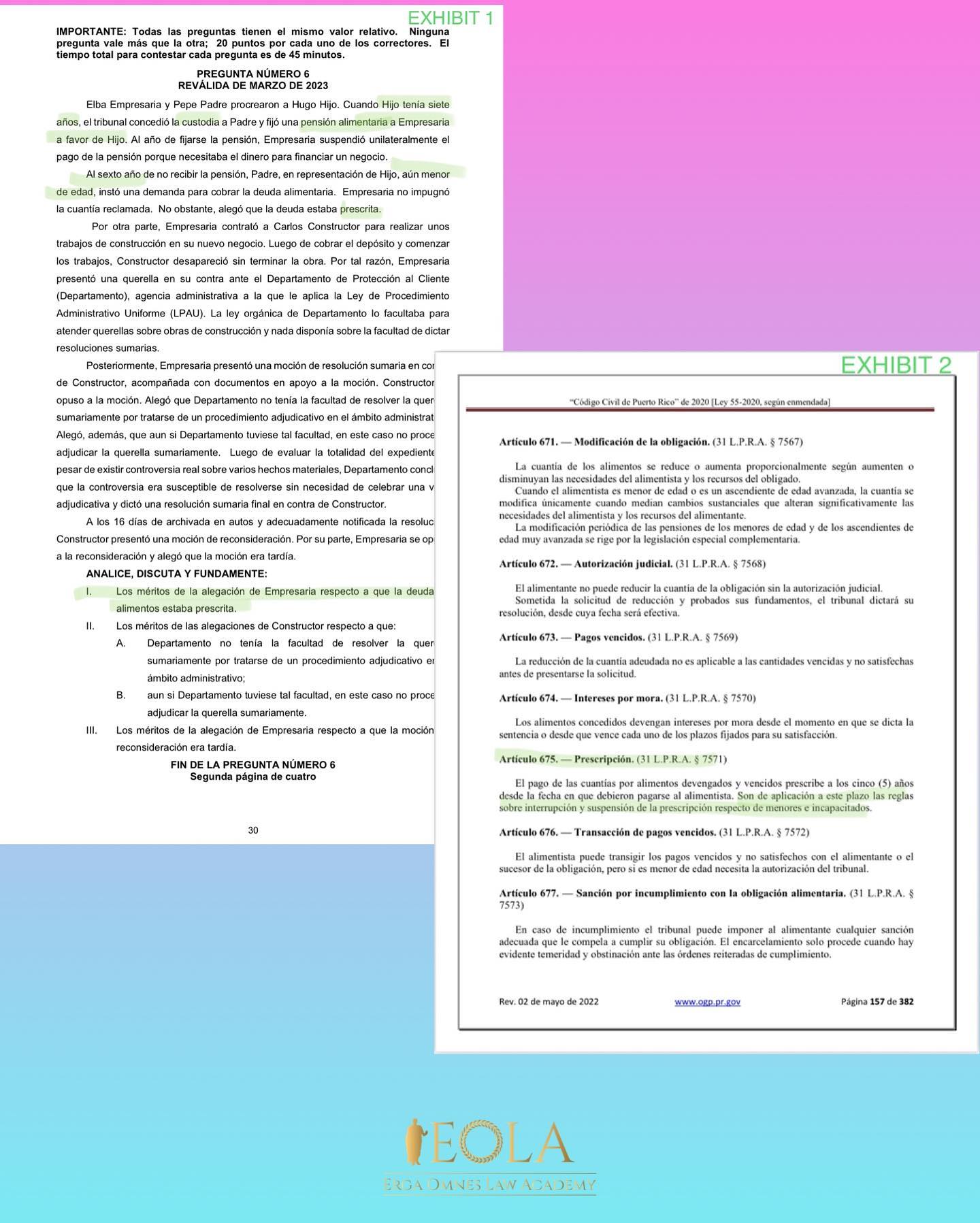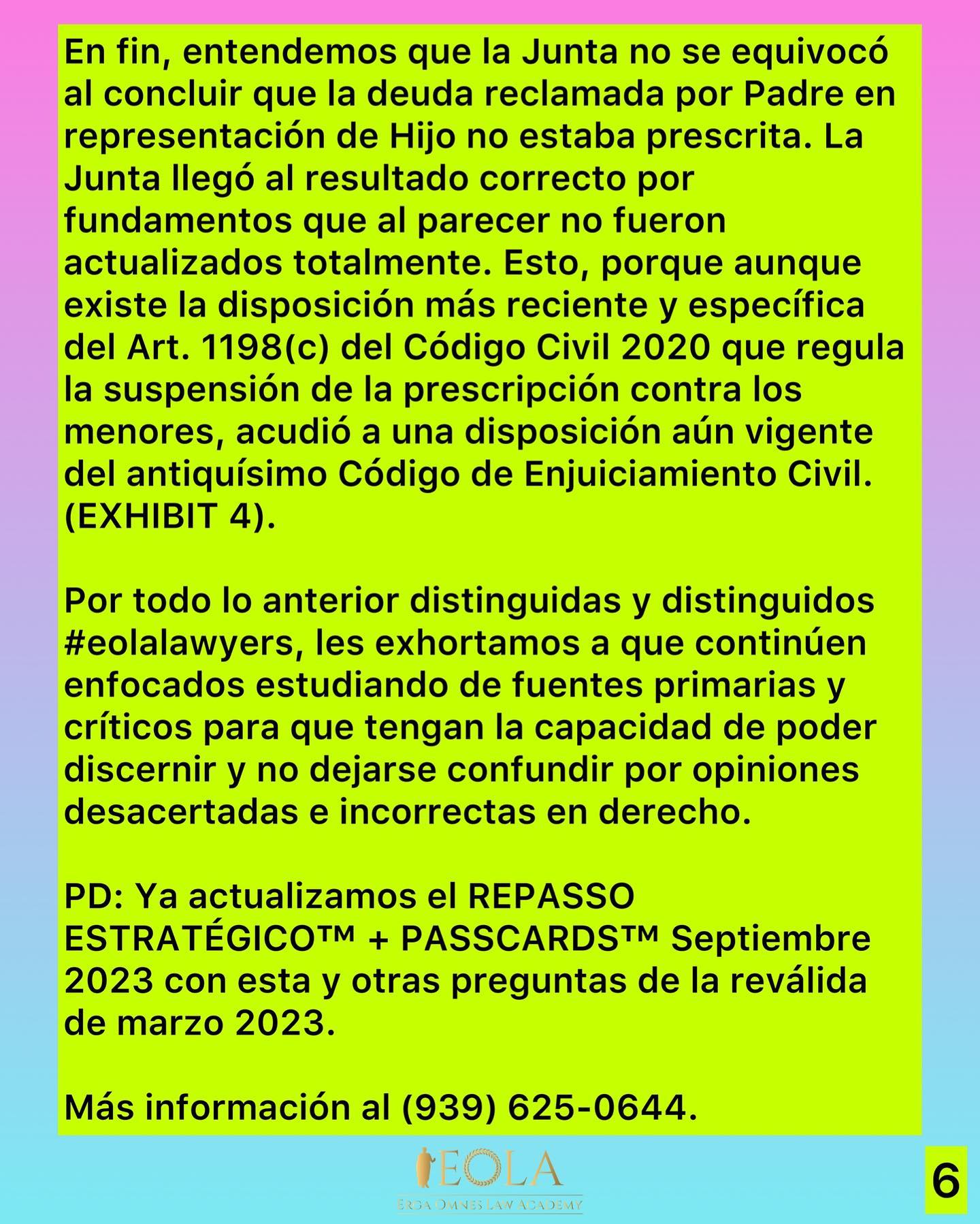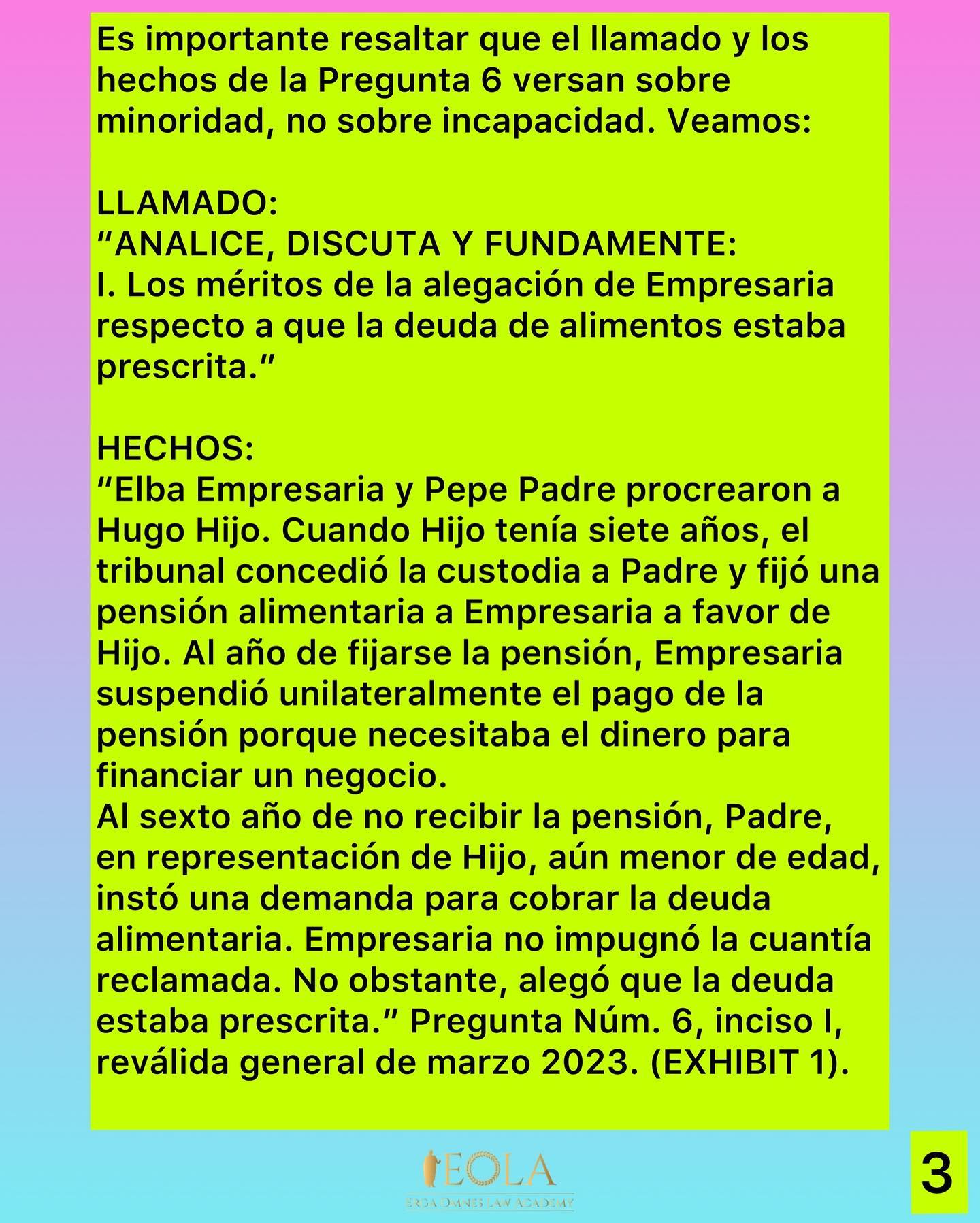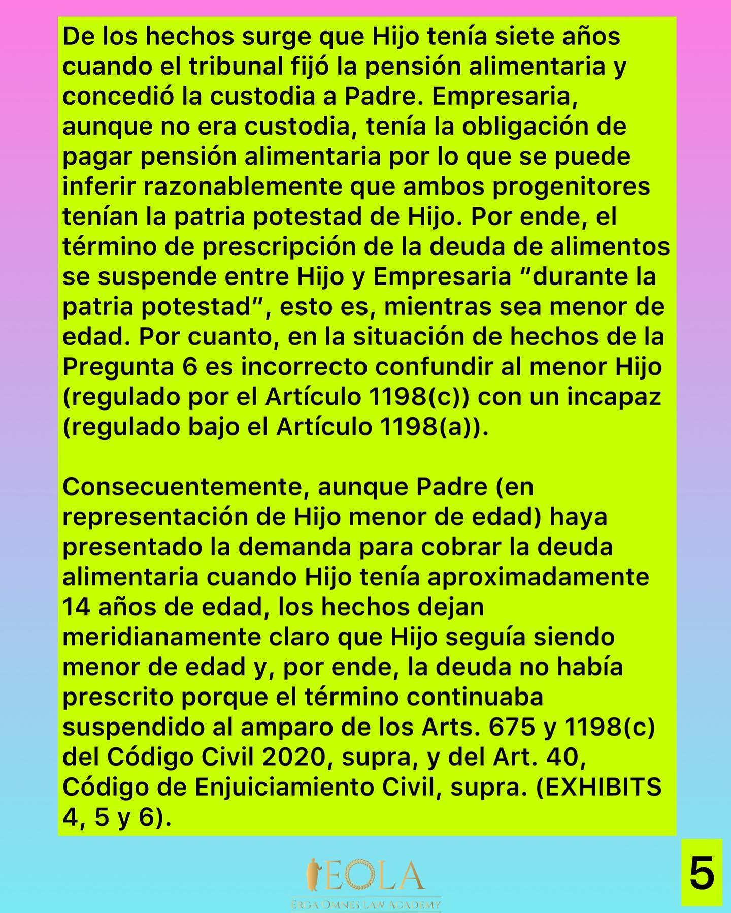 De una simple lectura de los hechos de la pregunta en cuestión surge claramente que, al momento de instar la demanda para cobrar la deuda alimentaria, Hijo aún era menor de edad, lo que implica que el término de prescripción seguía suspendido. Por tanto, la Junta concluyó correctamente que la deuda reclamada no estaba prescrita. La única deficiencia de la Junta fue fundamentar parcialmente su decisión en el Código de Enjuiciamiento Civil cuando existía una disposición específica en el Código Civil de 2020 que atendía esta controversia. No obstante, el resultado fue exactamente el mismo. Por eso es importante que los aspirantes confíen en que el examen es correcto en derecho. Les corresponde a estos entender y dominar las Sutilezas del Derecho más comúnmente preguntadas por la Junta. En este caso: no importa cuantas veces se alegue que prescribió la deuda de alimentos, si el sujeto es menor de edad, contra este NO transcurre la prescripción hasta que alcance la mayoría de edad.