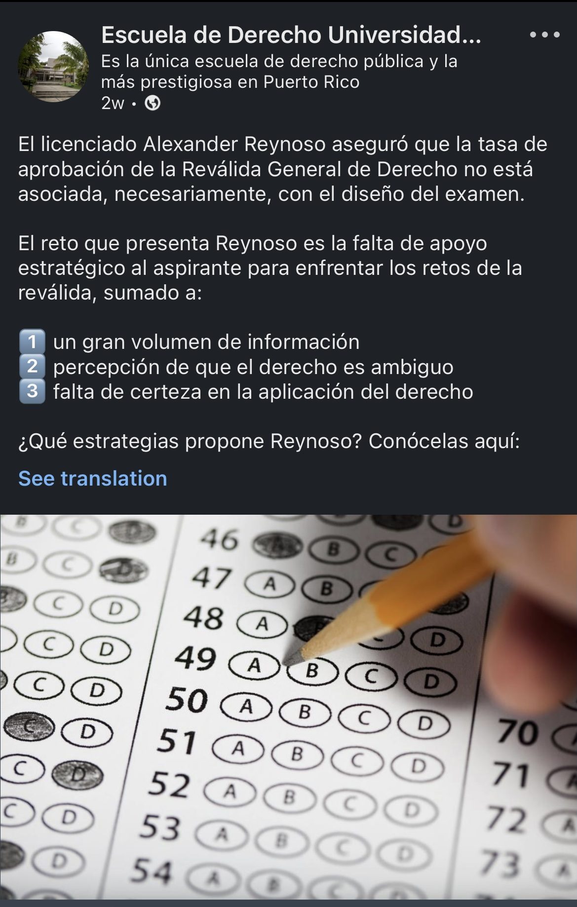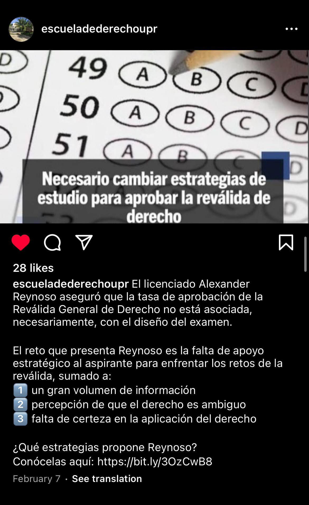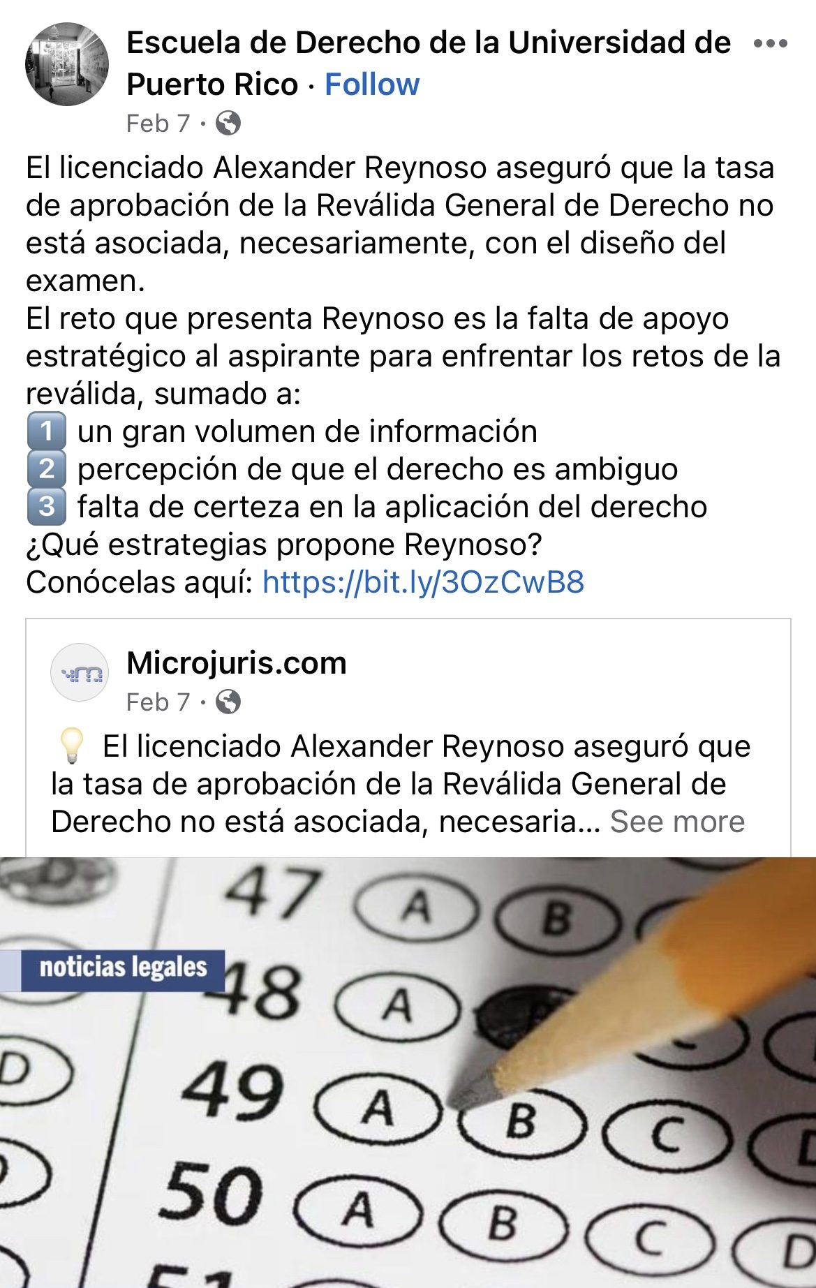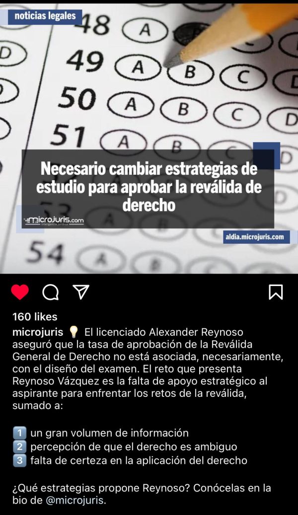 Luego de la Conferencia de EOLA en el Colegio de Abogados y Abogadas de Puerto Rico, MicroJuris publicó una reseña del evento intitulada: «Necesario cambiar estrategias de estudio para aprobar la reválida de derecho». Esta reseña recibió más de 160 likes en Instagram, entre otras plataformas digitales, y también fue compartida en sus redes sociales por la Escuela de Derecho de la UPR.  En resumen, la reseña resalta en detalle los puntos compartidos por el licenciado Alexander G. Reynoso Vázquez, Fundador & CEO de Erga Omnes Law Academy (EOLA), en la conferencia celebrada el 25 de enero de 2024.